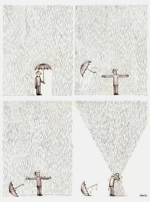 На этой иллюстрации, где человек сначала прячется от дождя, а затем обнимает его, плача, заключена вся суть психоаналитического понимания горя - горевания.
